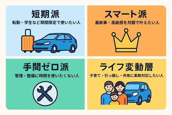 - 車を“買うほどじゃないけど、今すぐ必要”な人(転勤・引っ越し・通学など)