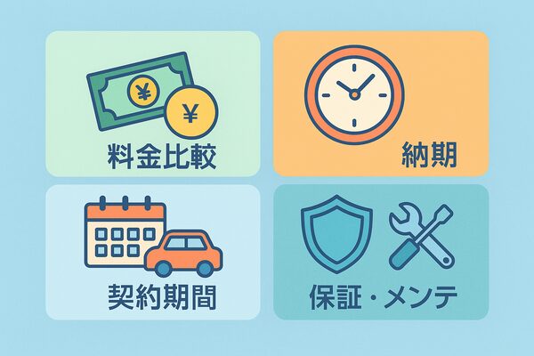 中古車サブスク選びの4つの重要ポイントを示すフラットイラスト。料金比較、納期、契約期間、保証・メンテをカラーアイコンで表示
