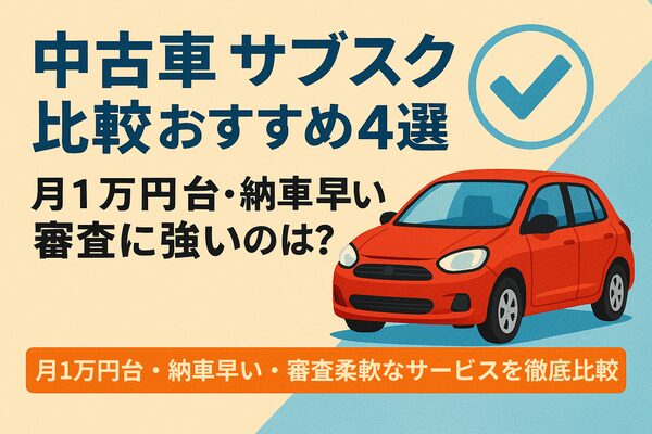 中古車サブスク比較おすすめ4選のイラストバナー。赤いコンパクトカーとチェックマーク、月1万円台・納車早い・審査に強いサービスを紹介するデザイン