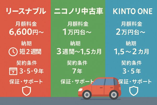 • 納期:リースナブルは最短2週間〜、ニコノリ中古車は最短3日〜2週間(在庫状況による)、KINTO ONEは約1ヶ月〜