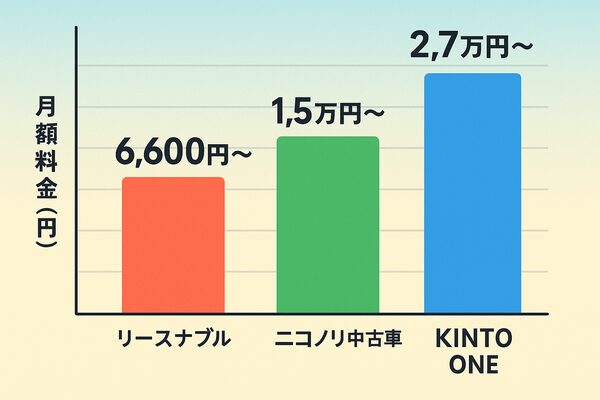 中古車サブスク3社の料金比較イラスト。リースナブル6,600円〜、ニコノリ中古車1.5万円〜、KINTO ONE2.7万円〜を棒グラフで表示
